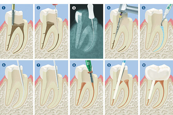 Le dentiste réalise le traitement endodontique d’une dent lorsque celle-ci ne peut plus être gardée vivante, soit parce qu’elle est déjà nécrosée, soit parce qu’elle risque de le devenir. Le traitement endodontique consiste à :